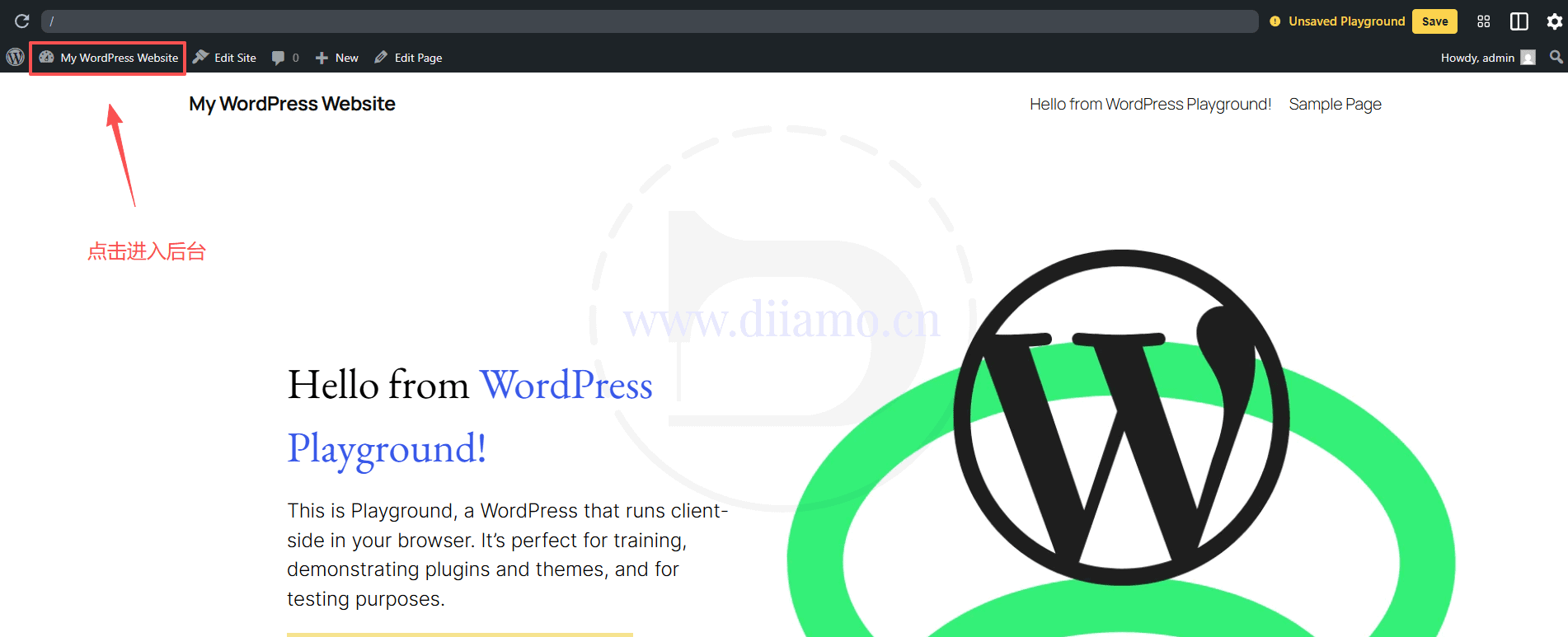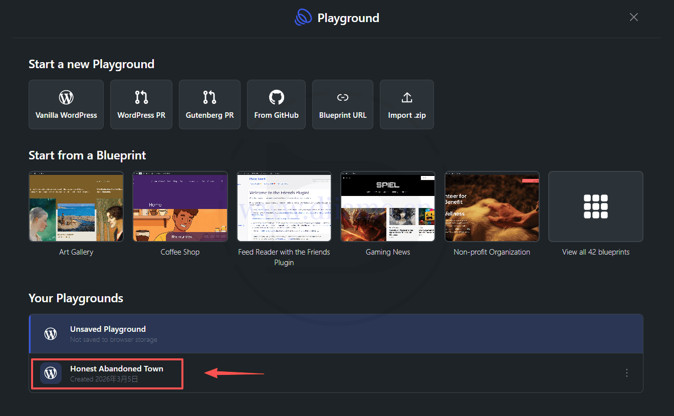 Tip: The temporary site you created in WordPress Playground will disappear when you close your browser, and you need to save it to make it permanent. The temporary site is for testing purposes only, please do not store important content.