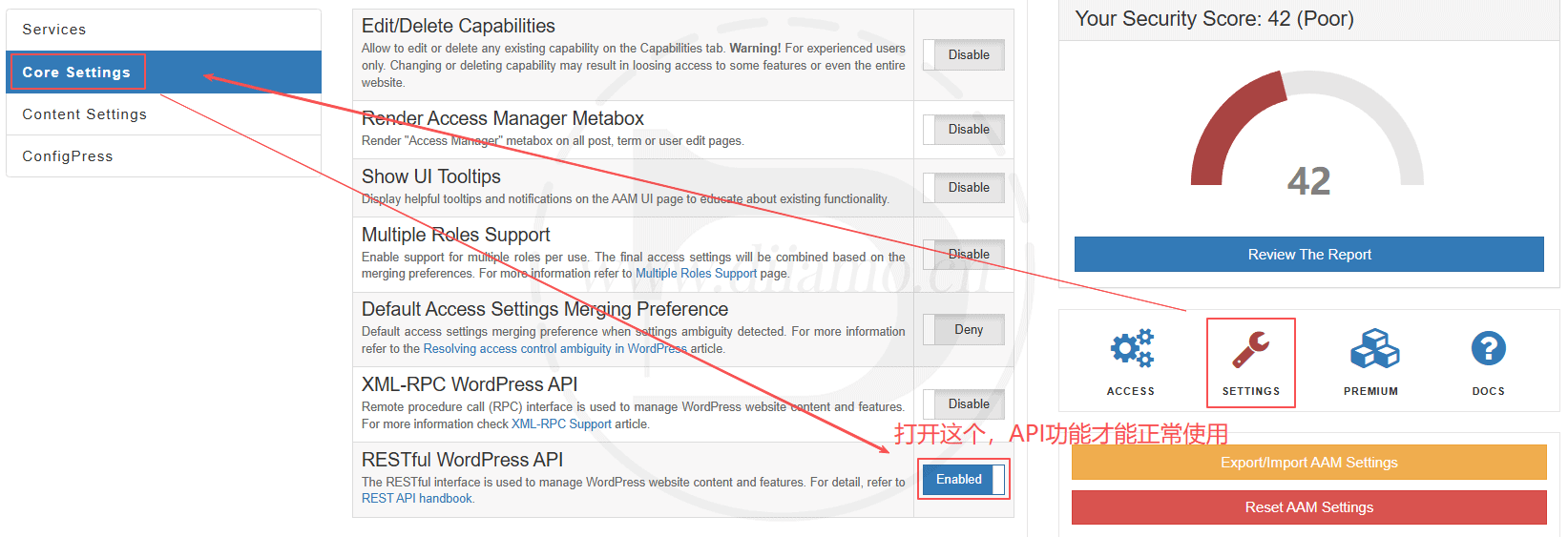 Tip: The “RESTful WordPress API” feature in the image below must be enabled, otherwise the API feature will be disabled. If you make a static website, you can disable it if you are sure you don't need the API function.