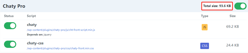 Chaty Pro 在前端加载93.6 kb代码↓,这个代码量跟同类型插件比算少了。