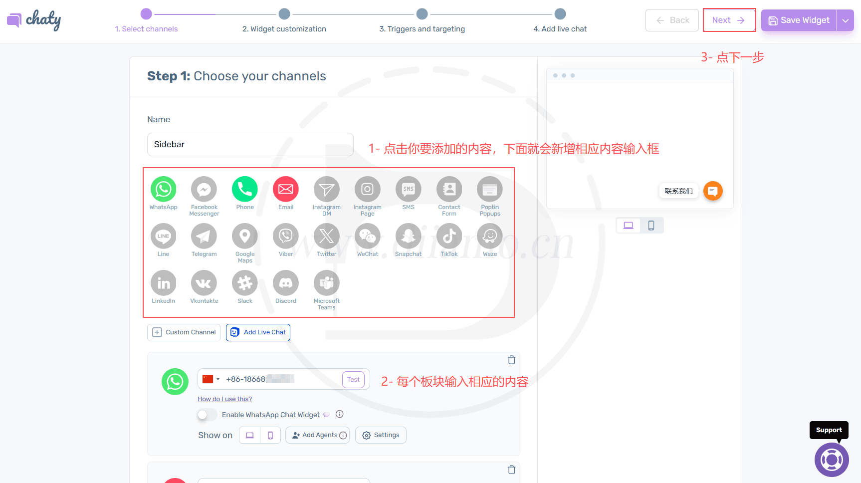 按下面步骤添加所需小部件,输入内容,点下一步。