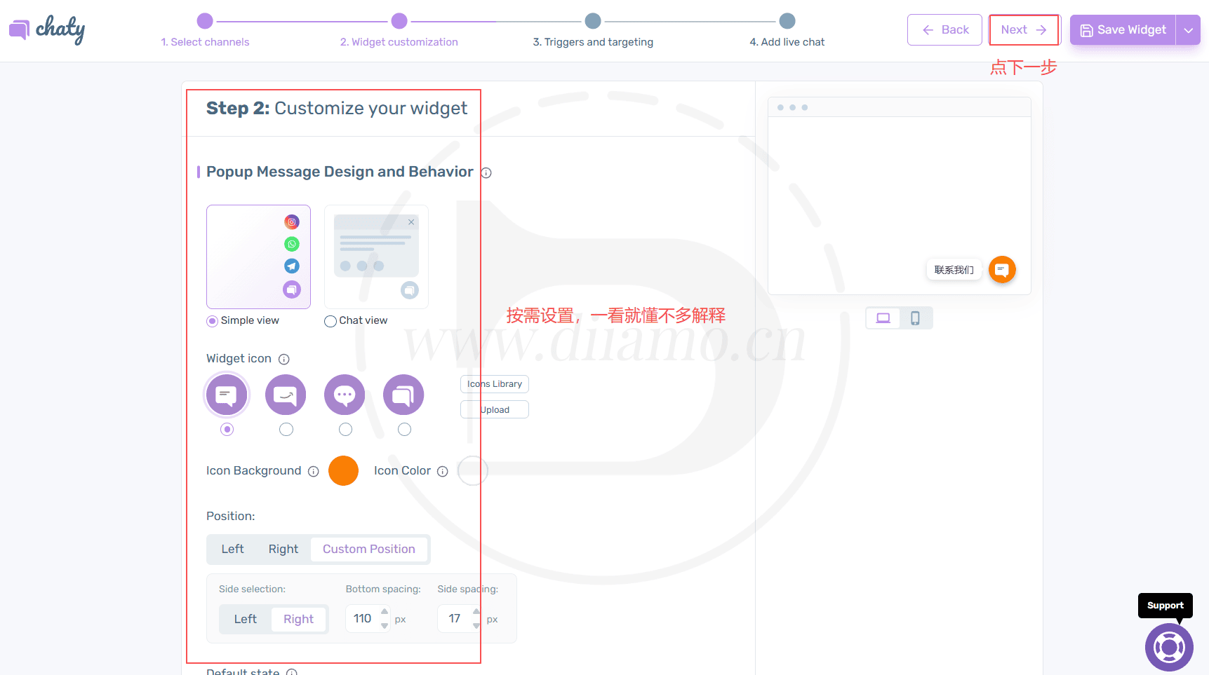 按需设置,这是设置侧边栏的外观,位置等,设置完点下一步↓。Tips:Position那里选Custom Position可以自定义间距,比较方便。